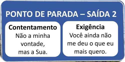 Quando você escolhe descansar em Contentamento, isso lhe custa alguma coisa. Mesmo que você esteja desapontado por não ter conseguido o que desejava intensamente ou queria, você ora a Deus em submissão à Sua vontade. Você pode expressar seu desapontamento, mas também expressar o desejo do seu coração de querer o que Deus lhe permite ter. Você deseja que Deus o ajude a crescer de acordo com Sua vontade. Desta forma, você encontra neste ponto de parada um bom descanso. Você pode até estar triste; entretanto, você se alegra porque Deus está planejando algo bom em sua vida, mesmo no desapontamento. No entanto, se quando chegar à Saída 2 você escolher a Exigência, também terá um custo a pagar.